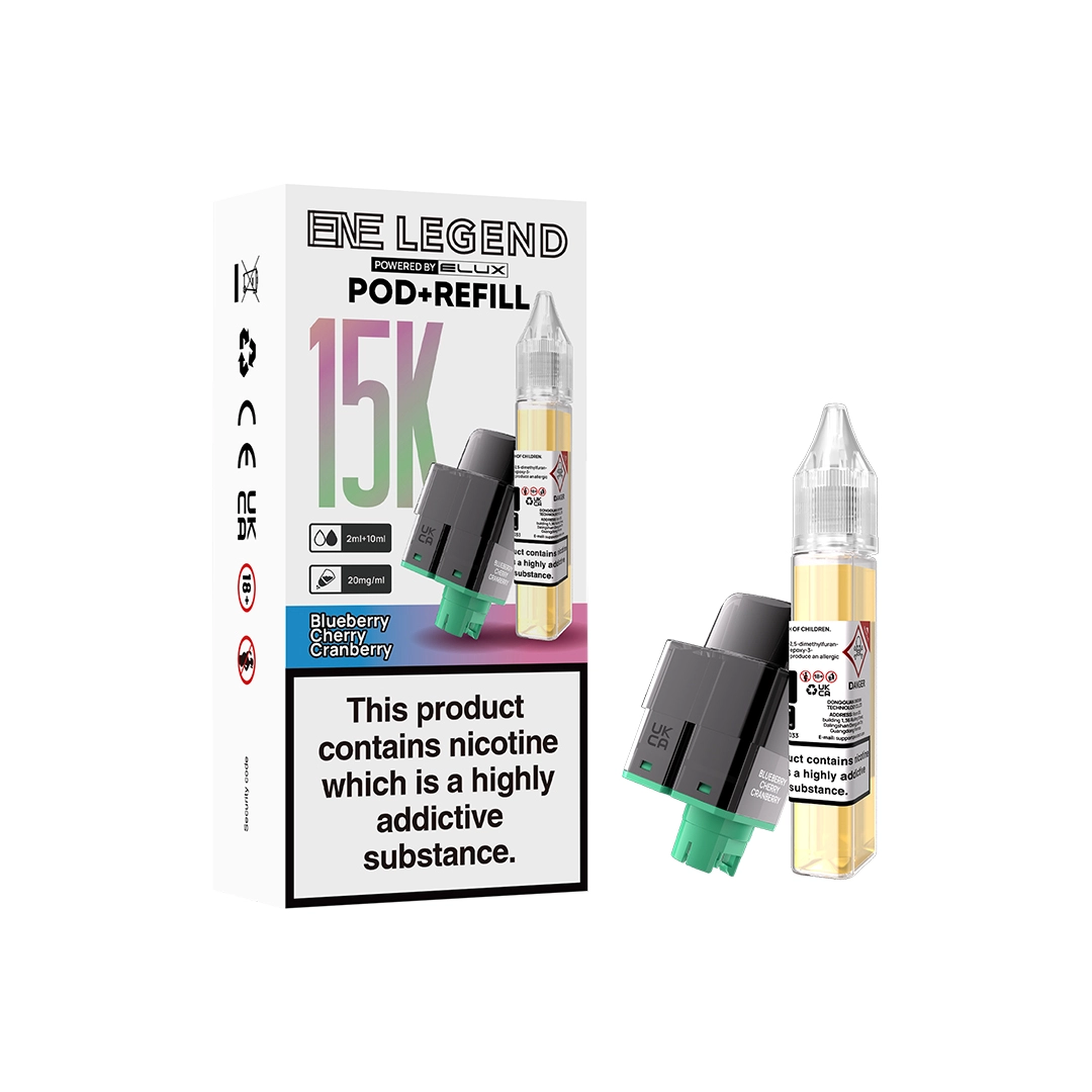 Blueberry Cherry Cranberry Elux ENE Legend 15K Prefilled Pods deliver a vibrant mix of sweet blueberries, juicy cherries, and tart cranberries. This trio of flavours creates a perfectly balanced vape that’s fruity, refreshing, and satisfying from the first puff to the last.
